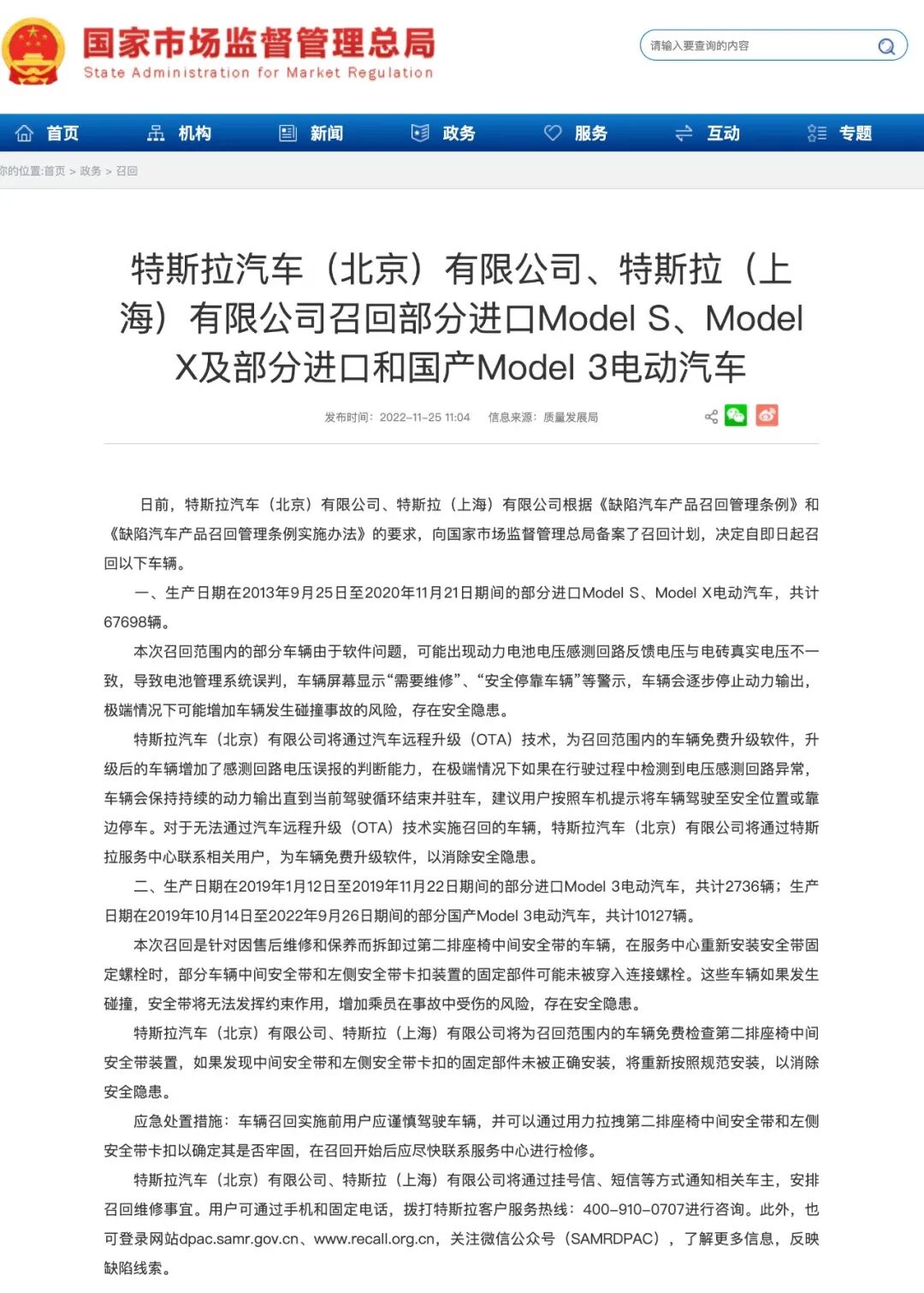 召回范围包括生产日期在2013年9月25日至2020年11月21日期间的部分进口Model S、Model X电动汽车,共计67698辆。原因为该批次部分车辆由于软件问题,可能出现动力电池电压感测回路反馈电压与电砖真实电压不一致,导致电池管理系统误判,极端情况下可能增加车辆发生碰撞事故的风险,存在安全隐患。