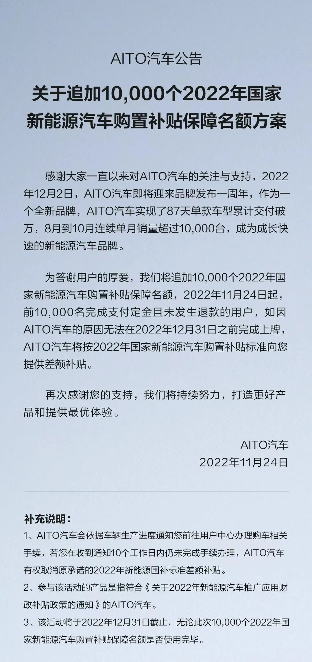 11月24日,AITO 问界公布,将追加1万个2022年国家新能源汽车购置补贴保障名额。自发布日起,前1万名完成支付定金且未发生退款的用户,如因 AITO 汽车的原因无法在2022年12月31日前完成上牌,官方将按2022年国家新能源汽车购置补贴标准向用户提供差额补贴。
