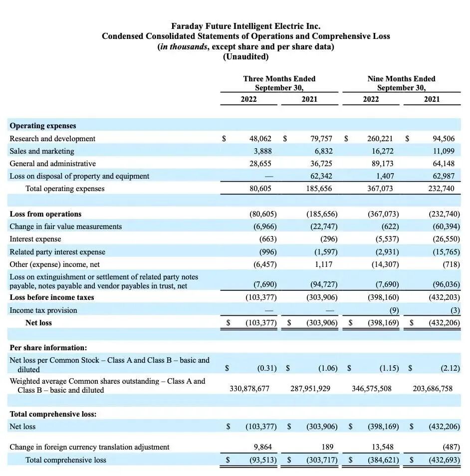 美国时间11月21日,法拉第未来发布2022年第三季度财报。财报显示,法拉第未来第三季度净亏损约为1.03亿美元,较去年同期3.04亿美元的净亏损额有所收窄。但同时法拉第未来也表示,FF91的首批交付时间不确定,预计不会在2022年内进行交付。