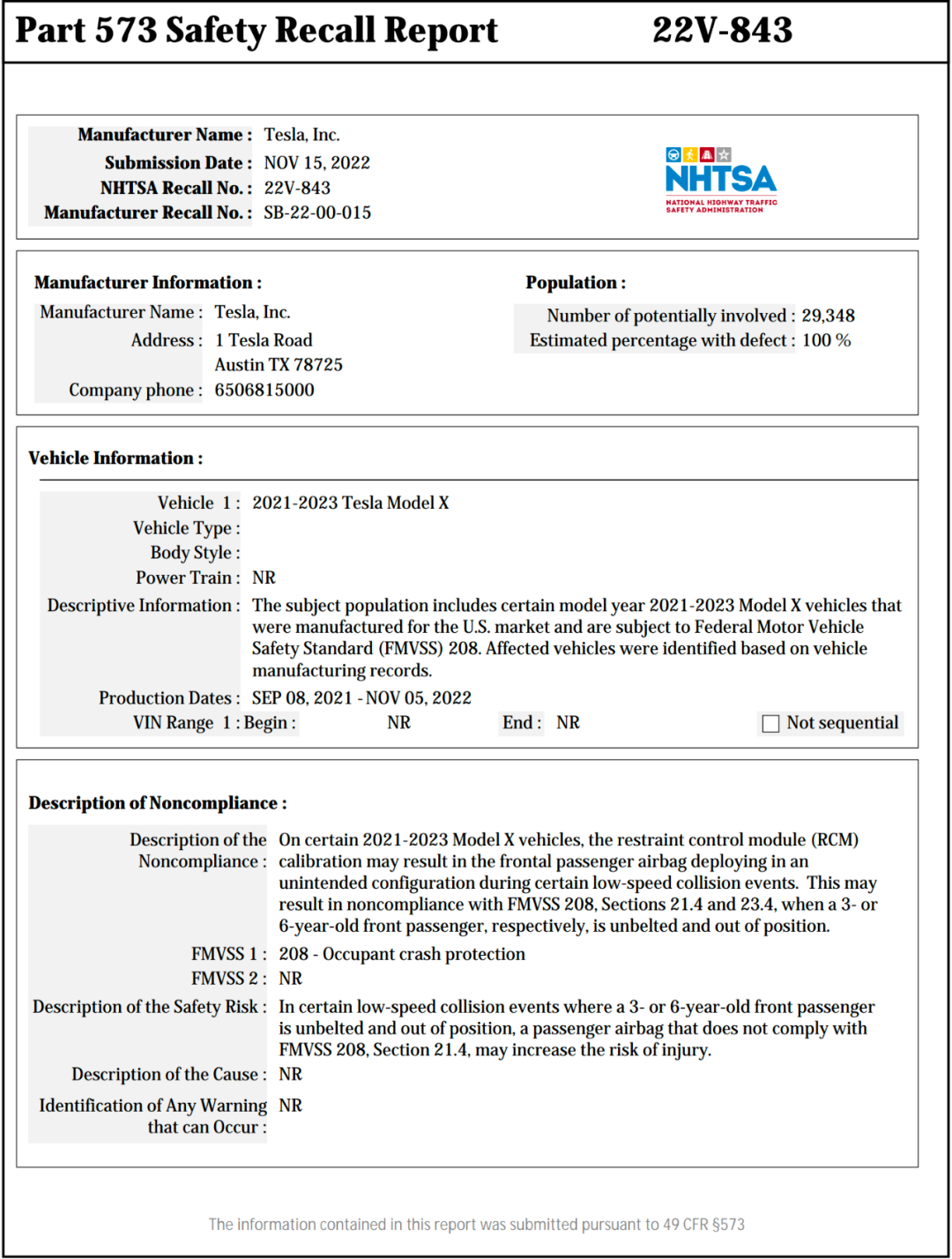 第一份是召回29348辆Model X,原因为车辆存在一个可能导致前排乘客安全气囊无法打开的隐患,该问题将通过OTA解决。