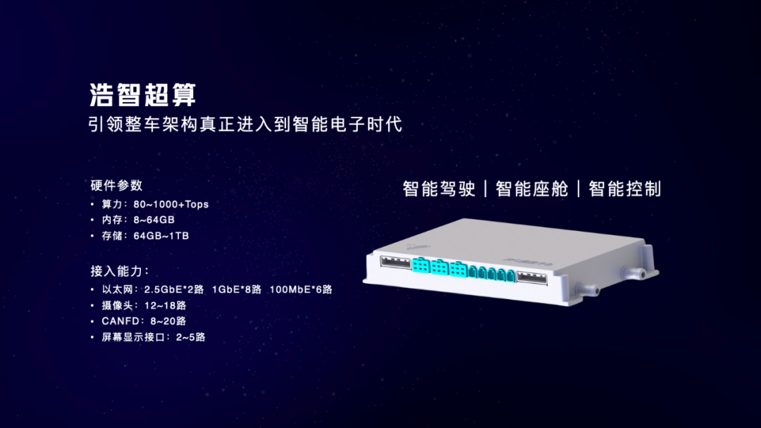 除了电驱、增程器这两项“电动化”的技术产品外,哪吒还针对“智能化”做了规划。其中浩智超算将是一个算力最高达1000Tops、支持L4级别自动驾驶、涵盖智能座舱的汽车“中央大脑”。这与全球顶尖科技公司在汽车智能化上的规划相一致。