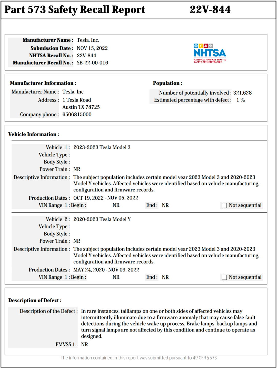 第二份是召回321628辆2023年款Model 3和2020-2023年款Model Y汽车,原因为车辆尾灯可能间歇性熄灭,从而增加碰撞的风险,后续将通过OTA解决。