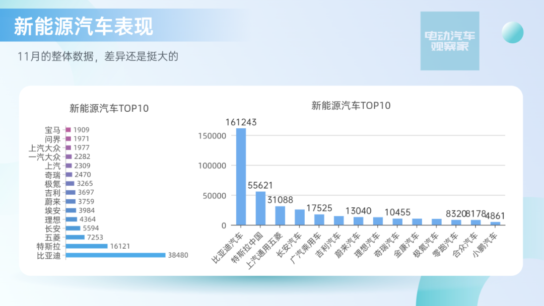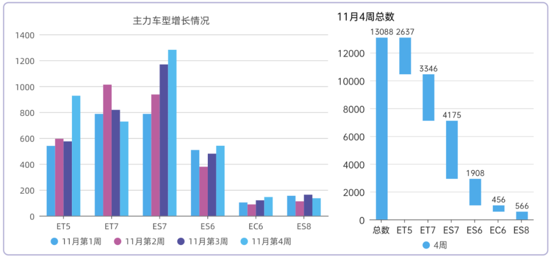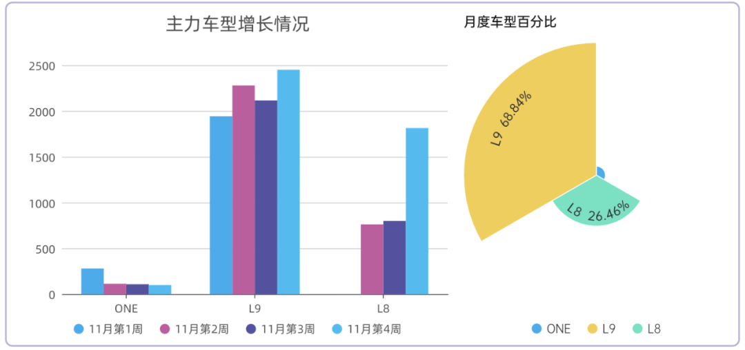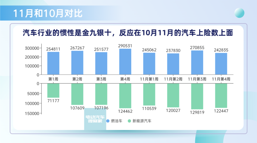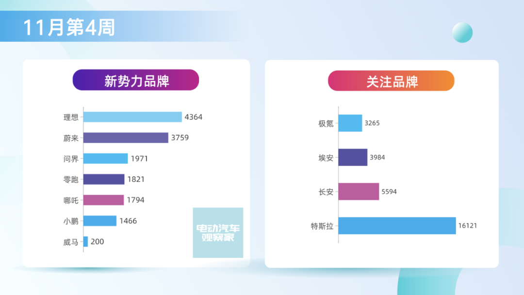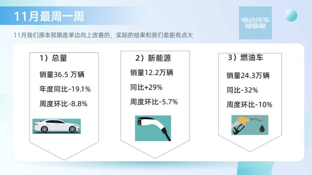 销量为24.3万,同比-32%,环比-10%。从燃油车的数据来看,今年疫情、宏观经济的影响特别大。如果我们把好几个周都放在一起就会发现,燃油车周度没有高点,而新能源汽车走势也和整个车市如出一辙了。比亚迪仍然独占鳌头,单周3.84万台,4个周累计16.1万台,没有对手。特斯拉单周1.6万台,4个周累计5.56万台,仍然比较强劲。五菱单周7253台,4个周3.1万台,位列前三名,也还维持较高水平。从新势力来看,理想汽车这个月比较猛,蔚来汽车排在第二。蔚来汽车11月四个周28天1.3万台,加上后面2天,预估单月1.4万台。ET5的周度数据开始慢慢起来了,目前ES7是主销车型,这是目前少有的订单不缺,但是看产能的品牌。理想汽车11月的4周总数为1.27万,加上两天预计1.36万台,随着L8的上量,整个结构也朝着比较正常的方向走。L9价格高,在消耗订单池,L8将是后续理想的主力车型。其他品牌方面,问界受重庆疫情影响很大;零跑和哪吒现在处在车型升级的转型期;小鹏的G9得努力交付啊,要不然就掉队了;特斯拉的量短期内没大突破;极氪这个月表现不错,冲到周度3200+,月度破万。很遗憾,临近年关,但市场面没有好消息。不过,疫情管控出现放松迹象,在年关买车的刺激下,也许势头会逆转。
