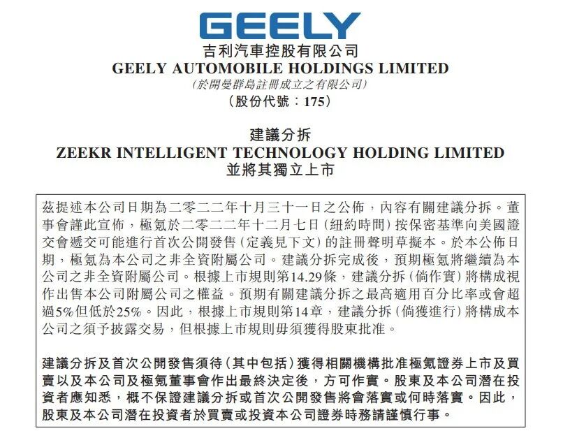 12月13日,吉利汽车发布公告,极氪已经于12月7日按保密基准向美国证交会递交可能进行首次公开发售的注册声明草拟本。翻译一下,就是极氪即将赴美上市。
