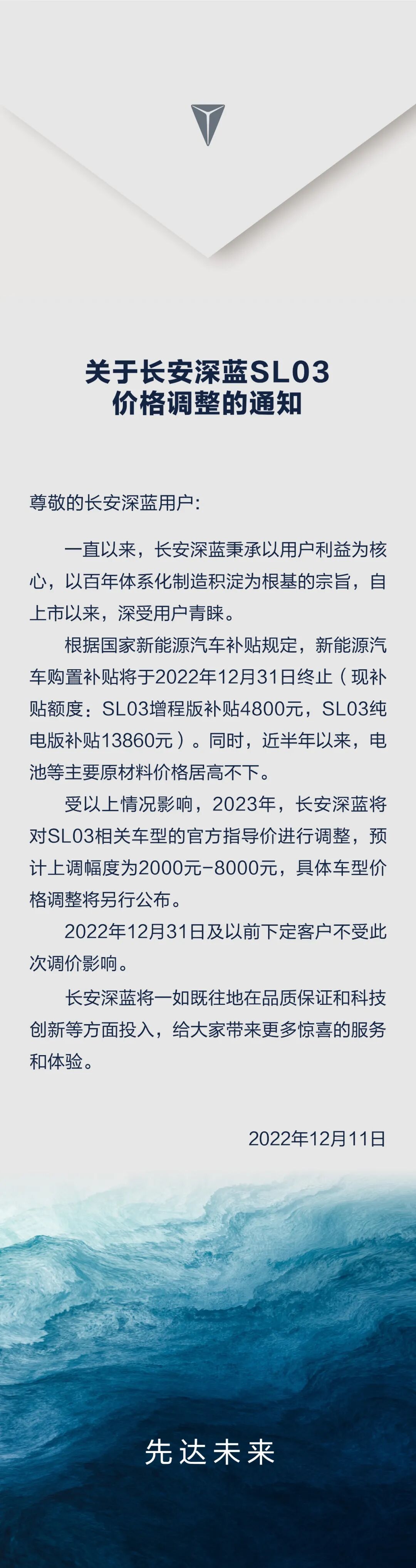 12月11日,长安深蓝发布关于深蓝SL03价格调整通知:2023年,长安深蓝将对SL03相关车型的官方指导价进行调整,预计上调幅度为2000元-8000元,具体车型价格调整将另行公布。2022年12月31日及以前下定客户不受此次调价影响。