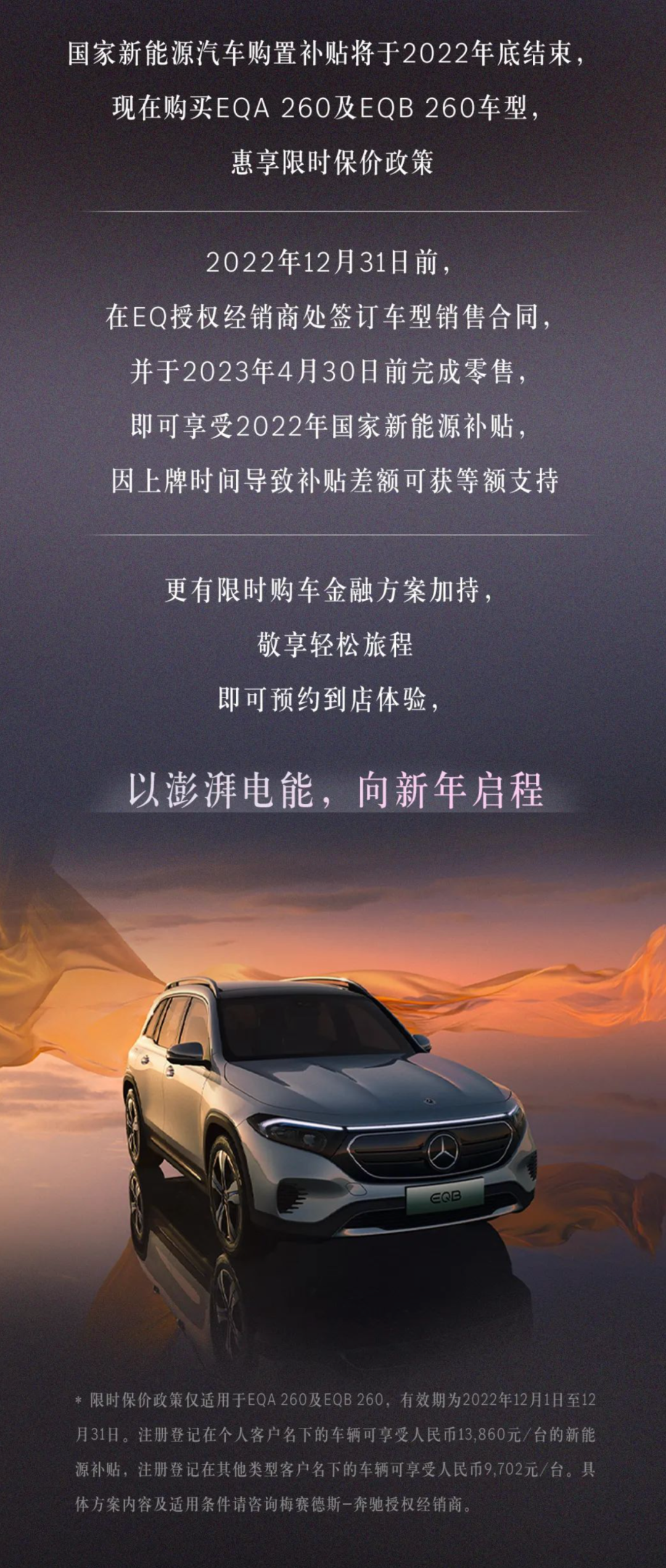 12月14日,梅赛德斯-奔驰公布了针对EQA 260和EQB 260车型的限时保价政策。具体要求为,于2022年12月31日前在EQ授权经销商处签订车型销售合同,并于2023年4月30日前完成零售。因上牌时间导致补贴差额可获等额支持。