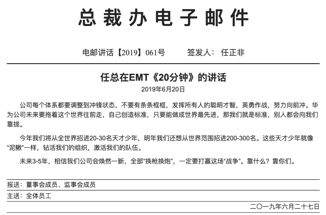 2019 年6 月华为发布全员邮件,披露了任正非在EMT《20 分钟》的讲话。