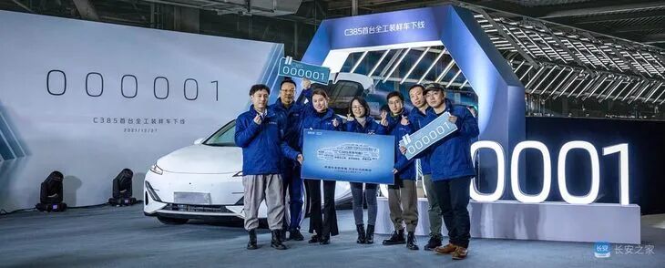 ■图说:12月28日,全新长安C385首台全工装样车在重庆正式下线。C385定位为长安汽车在电动车领域的首款战略车型。