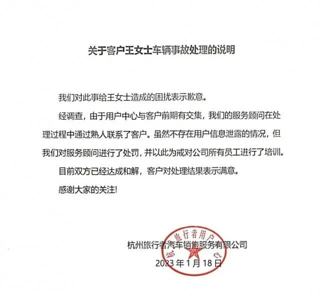 说明中表示:“经调查,由于用户中心与客户前期有交集,我们的服务顾问在处理过程中通过熟人联系了客户。虽然不存在用户信息泄露的情况,但我们对服务顾问进行了处罚,并以此为戒对公司所有员工进行了培训。目前双方已达成和解,客户对处理结果表示满意。”