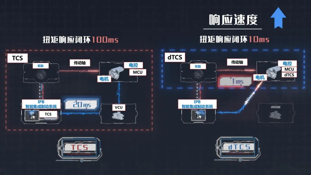 在地面有点滑、油门又给大了的时候,TCS会通过ECU分析车轮速度、车辆加速度、方向转角等数据,然后限制发动机的扭矩,直到车轮不会打滑为止。这就好比拉磨的驴跑太快了、磨跟不上,缰绳就会被挣脱。这个TCS就好比一个“驴嚼子”,目的只有一个,就是让驴别跑那么快。而dTCS技术中的d,意为分布式布局。比亚迪把TCS从ESP中剥离了出来,直接放进了电机控制器中(又一个分布式布局),直接绕过了ECU的控制。![]()
