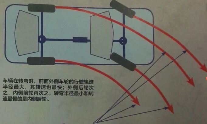 但EP9和Evija这种为了弯道而生的纯电赛车,对多电机的用法明显更加细腻。两者不约而同地选择了4台电机独立驱动每个车轮的模式,共配备4个单挡减速器,从“集中式布局”变成了“分布式布局”。想要实现的,其实是1+1+1+1>4的效果!为什么能大于4?我们知道,受车轮行驶轨迹半径影响,车辆在转弯时4个车轮之间的轮速是不完全相等的,外侧车轮会更快一些。就像这样:![]()