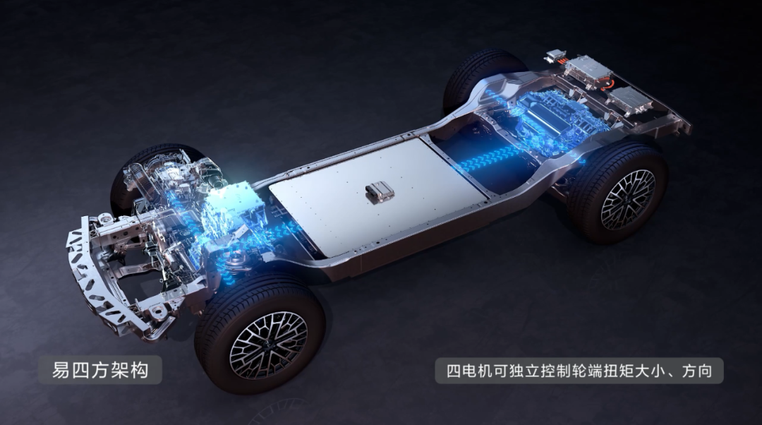 但从比亚迪iTAC的宣传来看,其实并没有涉及以下几个场景。就比如单侧车轮打滑,无法通过电机转速来判断怎么办?再或者转弯时单侧前轮压上暗冰,车身剧烈失控怎么办?既然一个电机控制两个车轮没办法判断转速,那是不是用一个电机独立控制一个车轮,就能用电机转速准确监测轮速了?既然ITAC只能输出正扭矩、让车辆在高速状态下更快更稳,那如果用极强的动能回收输出输出负扭矩,是不是就能在低速或者减速状态下稳定车身姿态了?没错,此次发布的易四方,就彻底解决了这两个问题——![]()