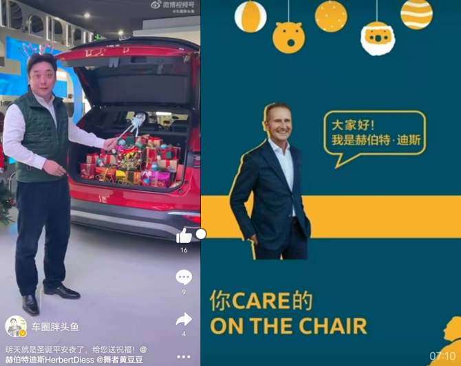 2021年圣诞节前夕,上汽大众汽车销售有限公司总经理俞经明和大众集团CEO迪斯亲自下场打广告