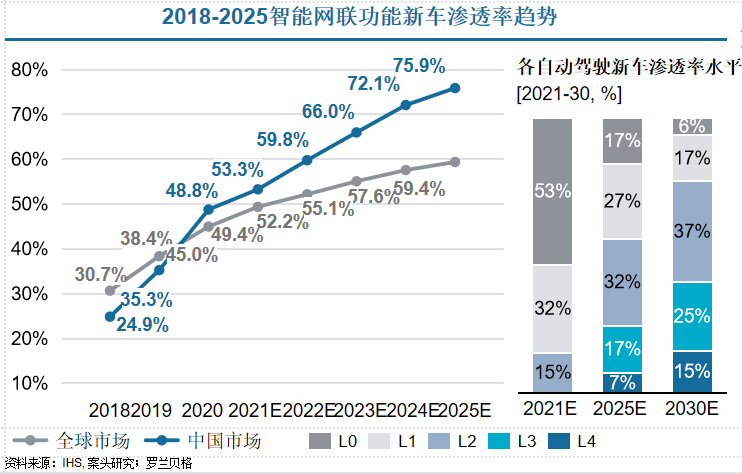 新能源汽车在中国的大众化,与汽车智能化的飞速发展密切相关。电观大会嘉宾罗兰贝格合伙人袁文博的研究数据显示,自2020年起,中国智能网联功能新车的渗透率开始超过全球市场平均水平。到2025年,中国智能网联车的渗透率预计接近76%,远高于全球近60%的水平。![]()