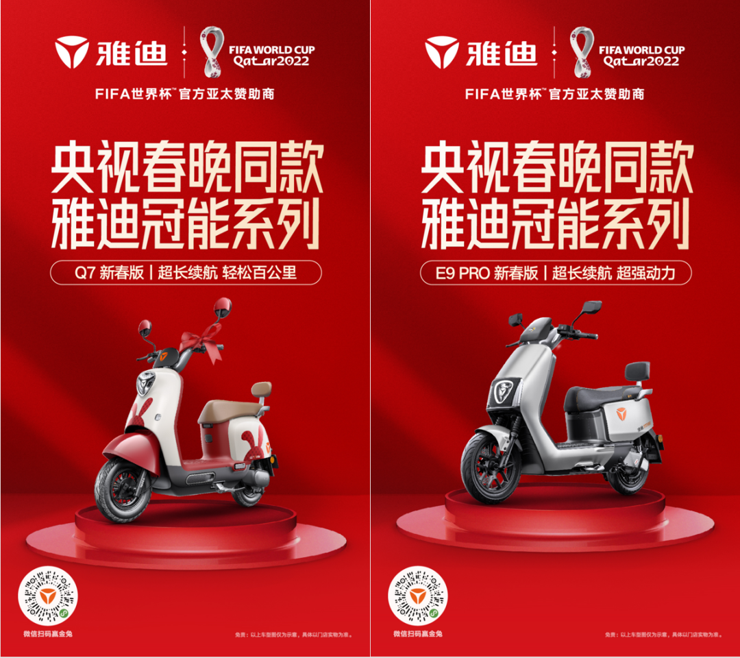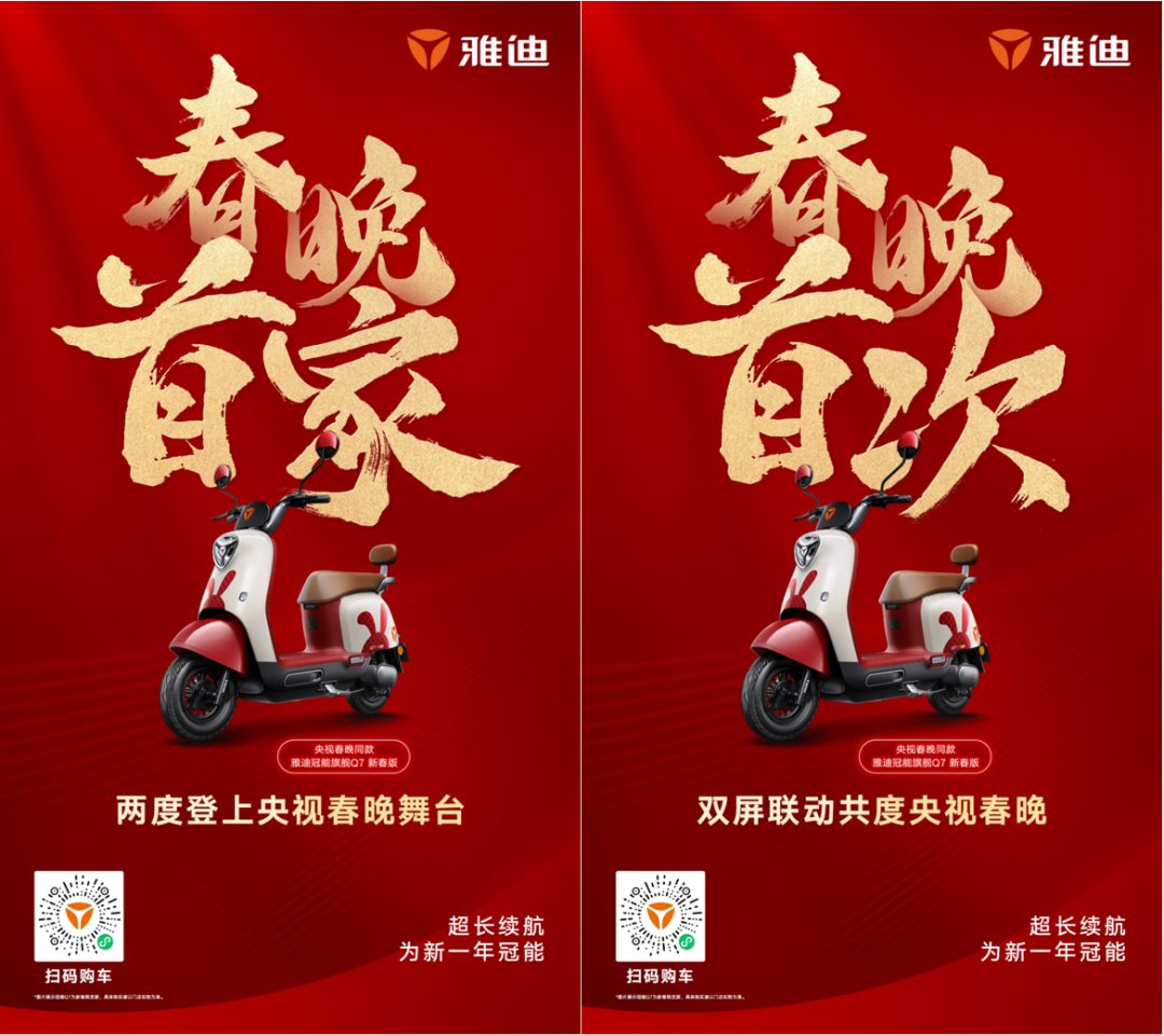 在辞旧迎新之际,央视春晚、央视《Young在春晚》以情感充沛的大国自信姿态,面向全球讲述中国故事。感动之余,中国智造的出镜,同样成为全球关注的焦点。代表电动两轮行业,雅迪接连登陆《Young在春晚》和央视春晚,在全球瞩目的中国盛宴上送出新春祝福,展现中国自信,#在春晚被种草了的电动车等热搜话题热度持续飙升!持续领航电动车品类价值提升,雅迪让整个行业与有荣焉!数据显示,央视春晚电视端直播平均收视率达20.23%,新媒体直播用户规模达6.55亿人,竖屏看春晚累计观看规模达1.79亿人。央视频客户互动人次达1.08亿次,全球170多个国家和地区同步直播报道。《Young在春晚》相关话题热度超31亿,狂揽111个热搜热榜。作为行业首家两度登上央视春晚舞台、双屏联动共度央视春晚的品牌,雅迪将借助央视鼎力支持“鼓风前行”,作为中国品牌名片实现全球曝光,为加速全球化注入新动力。以科技创新为驱动,雅迪代表的中国智造挺起了全球大竞争时代下的民族脊梁。连续6年销量全球第一,雅迪以奋斗姿态向世界级企业持续前行,成为中国品牌的全球新名片。风靡全球的央视春晚同款雅迪冠能系列车型接连登上“大小屏春晚”,是央视对雅迪以科技铸就全球领先、让亿万人享受美好出行的认可,以雅迪为标杆诠释科技强国真谛,向全球展现中国科技力量。为者常成,行者常至。胸怀“服务全球用户,成为世界级企业”愿景,陪伴国人25年的雅迪在新的一年率先领航出发,继续充满光荣和梦想的远征,以中国科技智慧和中国品牌力量改变世界。