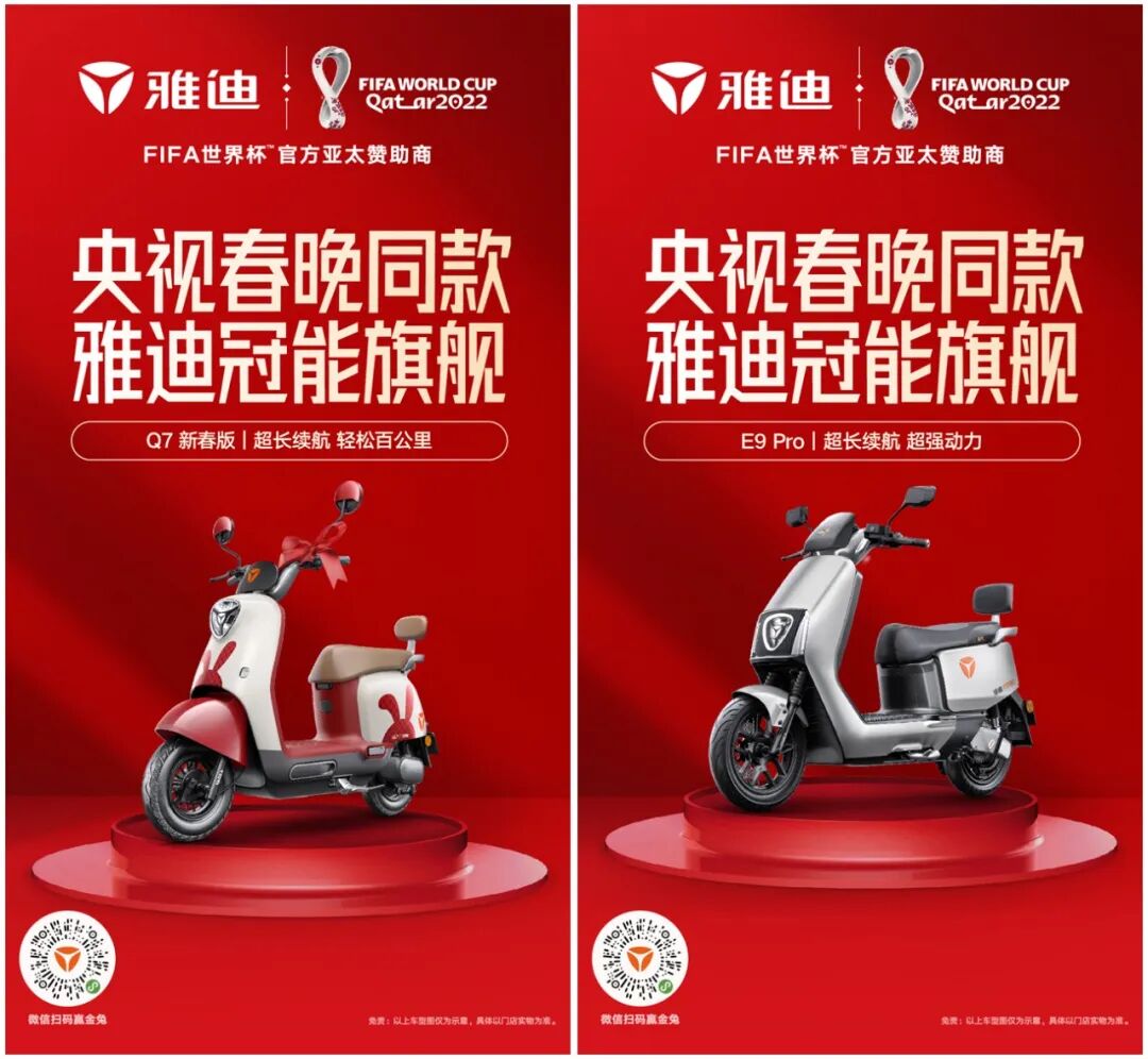2023年,雅迪携冠能旗舰车型登陆央视春晚,成为行业首个两度登上央视春晚、双屏联动共度央视春晚的品牌。