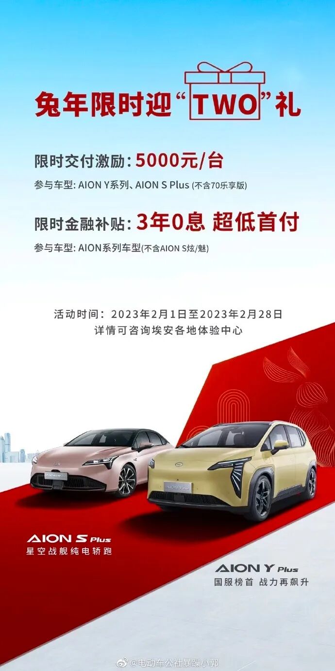 具体政策如下:在2023年2月1日至2023年2月28日,购买AION Y系列、AION S Plus(不含70乐享版)可享5000元/台的限时交付激励;AION全系车型(不含AIONS炫/魅)可享3年0息的限时金融补贴。