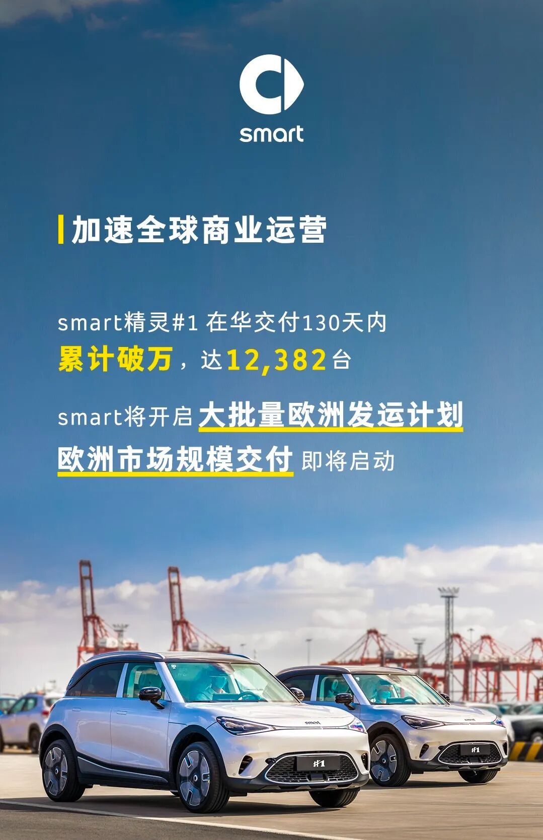 2023年1月,smart精灵#1在华交付3170辆。此外,作为全球车型,smart精灵#1自本月起还将启动欧洲发运计划,在欧洲市场进行批量交付。