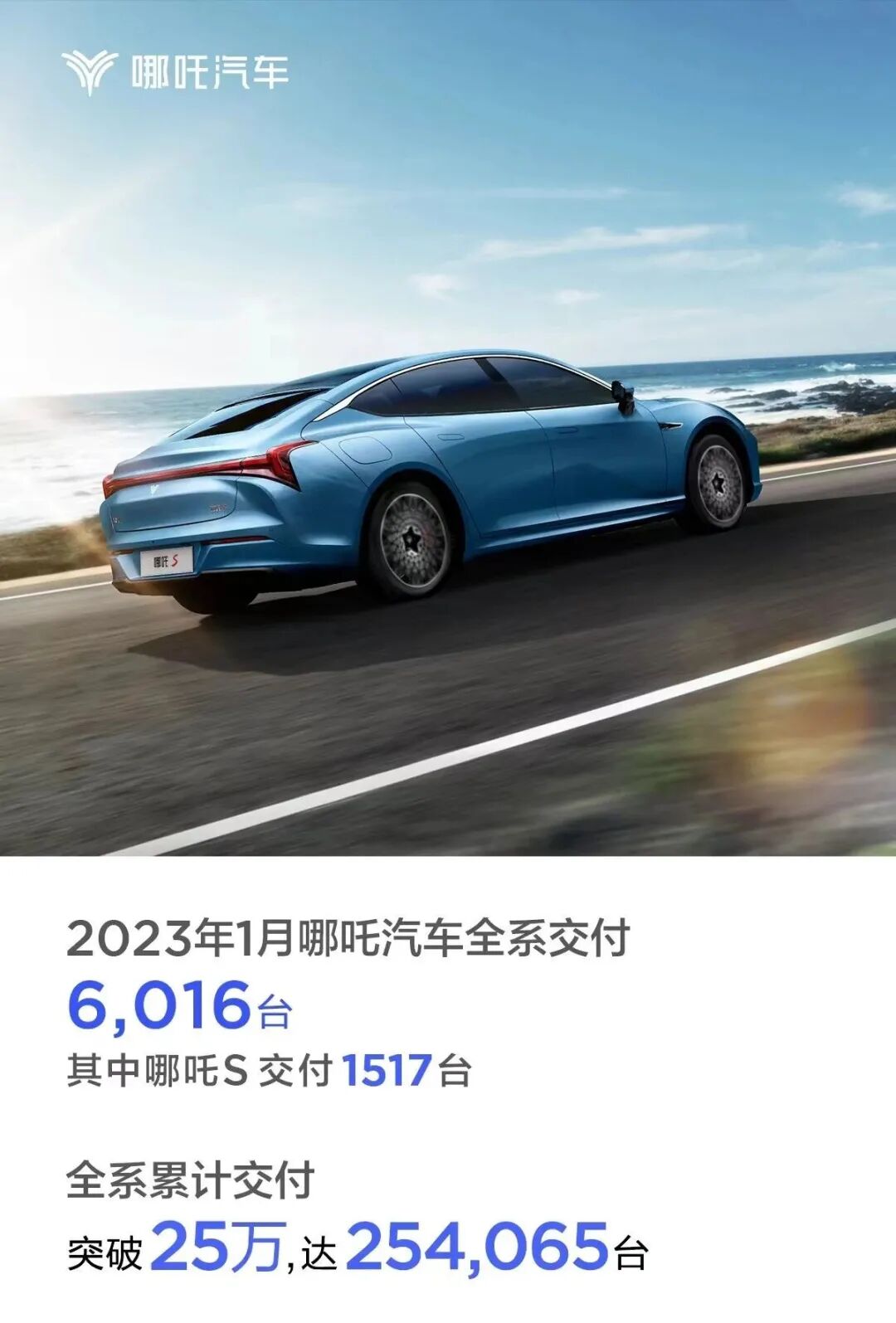 2023年1月,哪吒汽车交付6016辆。其中哪吒V交付3487辆,哪吒U交付1012辆,哪吒S交付1517辆。