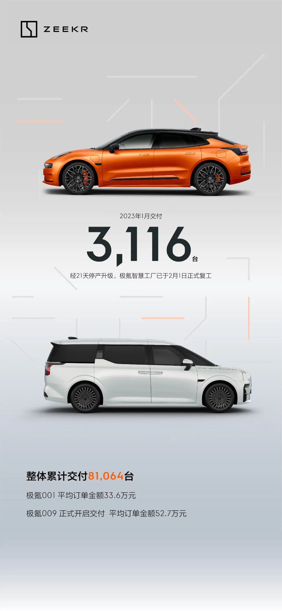 2023年1月,极氪汽车交付3116辆。