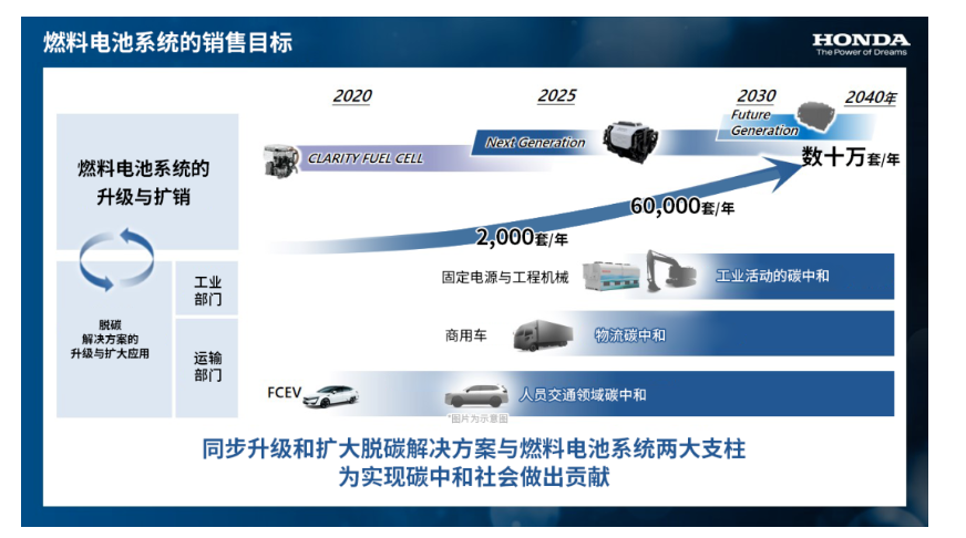 本田在氢能源技术上已经钻研了30多年,从2013年开始,本田还致力于与通用汽车共同开发新一代燃料电池系统。到2020年代中期,本田计划开始每年对外销售2000套燃料电池系统,到2030年,争取每年销售6万套,2030年代后半期力争每年销售数十万套。此外,据称搭载了该系统的燃料电池汽车,将于2024年在北美和日本上市。