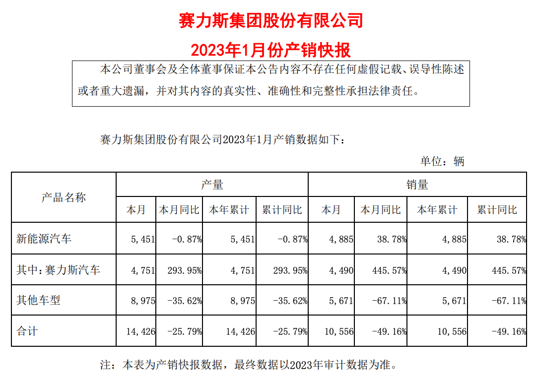 赛力斯汽车1月销量为4490辆;