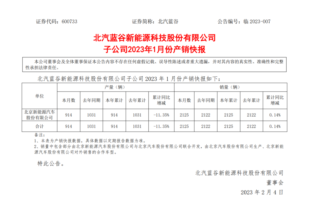 近日,根据北汽蓝谷公告,北汽新能源2023年1月销量为2125辆。
