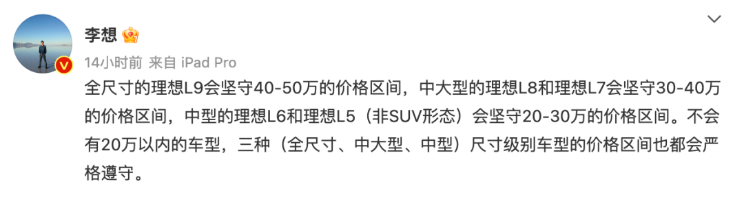 1月30日,李想个人微博提及了全新理想L5。李想表示,“中型的理想L6和理想L5(非SUV形态)会坚守20-30万的价格区间。不会有20万以内的车型。”