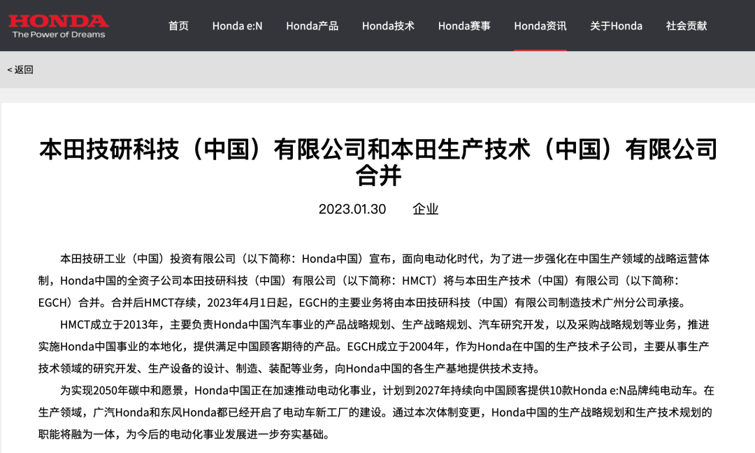 1月30日,本田中国宣布旗下全资子公司本田技研科技(中国)有限公司(HMCT)将与本田生产技术(中国)有限公司(EGCH)合并,合并后HMCT存续,EGCH的主要业务将由HMCT制造技术广州分公司承接。