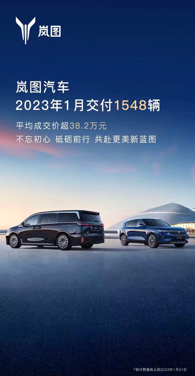 2023年1月,岚图汽车交付新车1548辆。