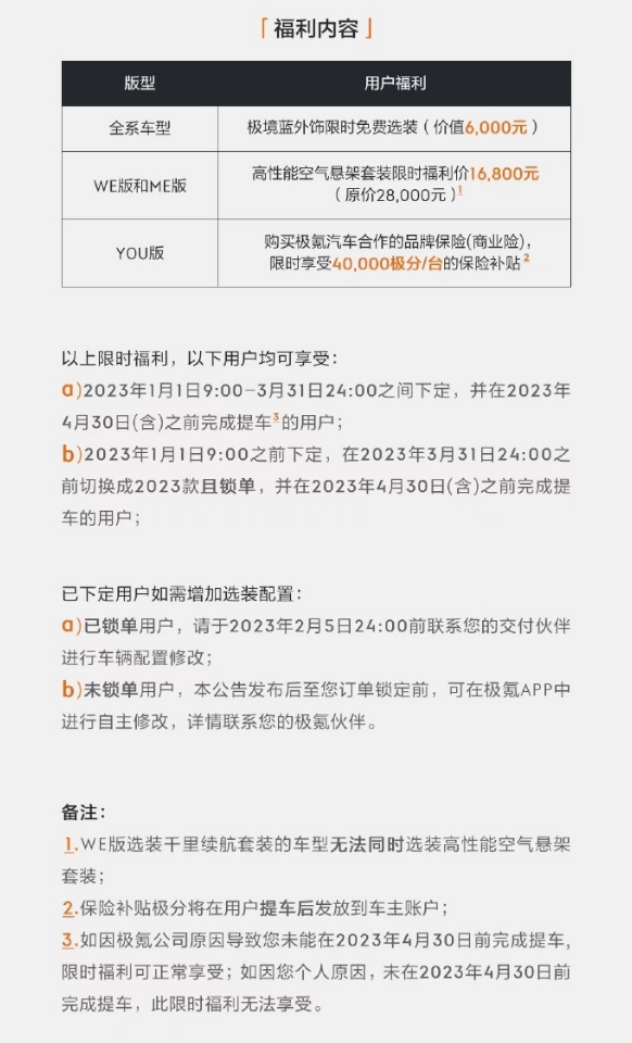 但在同一天,极氪001又推出了限时福利政策,用户限时可享6000元起的选装优惠以及40000积分的保险补贴,看来今年的销量压力依然很大。或许极氪前几天曝光的第三款车上市之后,又会成为极氪新的增长点。