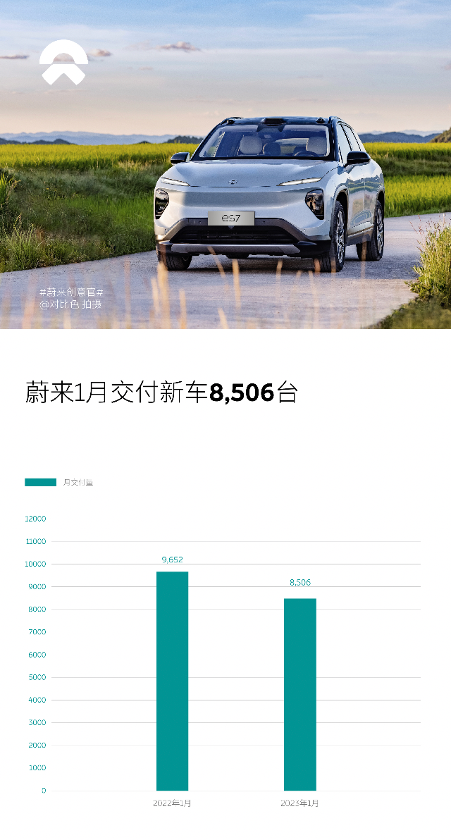 2023年1月,蔚来汽车交付8506辆。其中SUV交付2190辆,轿车交付6316辆。