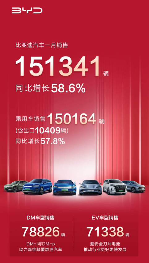 比亚迪1月销量为151341辆;