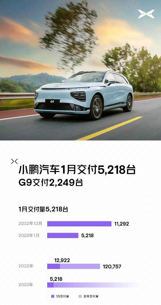 2023年1月,小鹏汽车交付5218辆,其中小鹏G9交付2249辆。