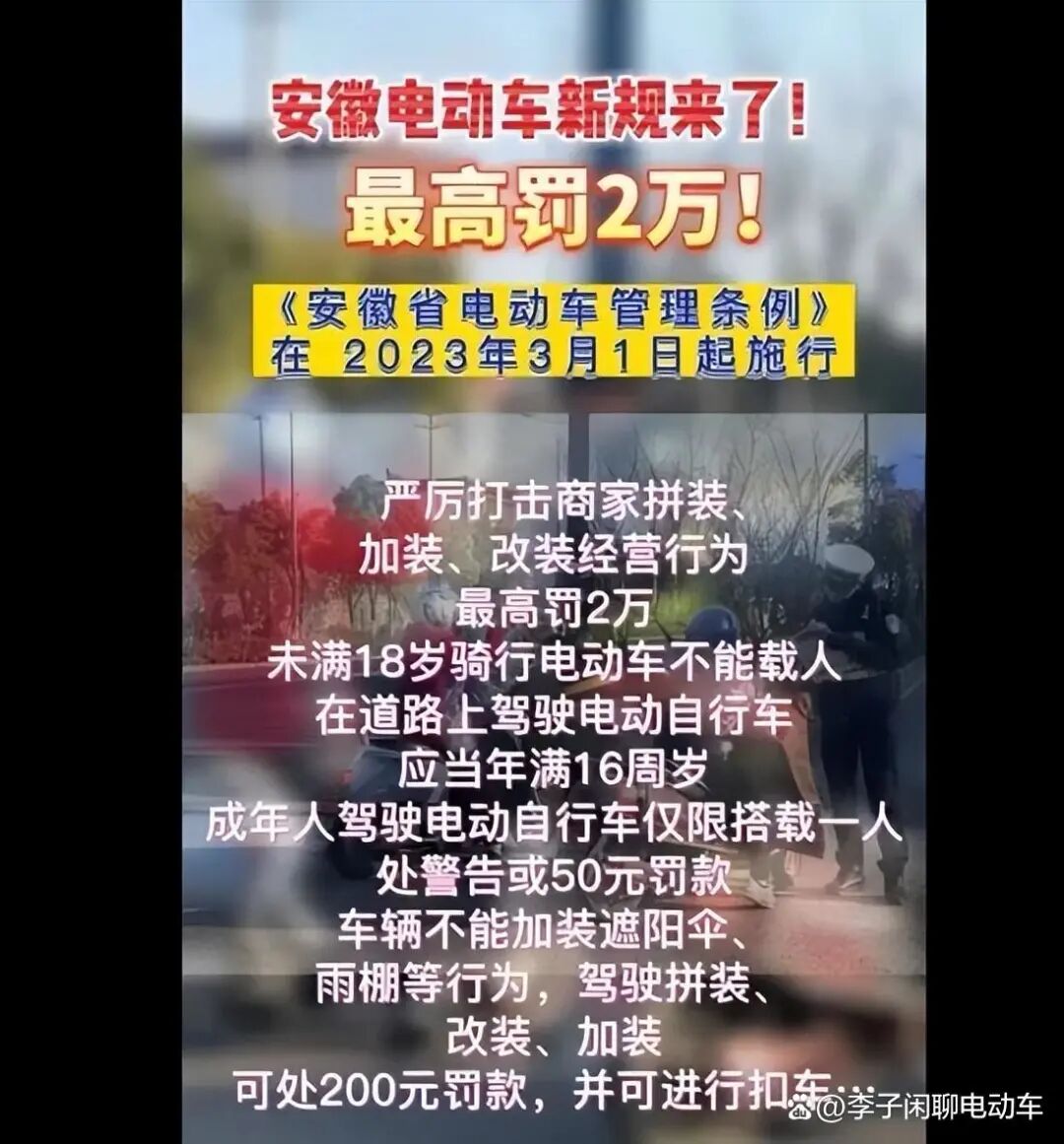 安徽电动车新规来了!自3月1日起,驾驶电动车不佩戴安全头盔,处5元以上50元以下罚款或警告;驾驶拼装、改装、加装车篷等装置电动自行车上道路行驶的,由公安机关交通管理部门责令改正,进行处罚。《安徽省电动自行车管理条例》针对电动自行车生产、销售、维修、登记、通行、停放以及相关保障与管理活动等做出明确规定,即将于2023年3月1日起施行,针对大家关心的热点问题,2月8日,安徽交警做出相关解答。除了上牌上路外,驾驶电动自行车上道路行驶时,应当保持电动自行车的制动、鸣号、灯光和夜间反光装置等符合安全技术要求,且号牌不得故意遮挡、污损。《条例》对驾驶电动自行车上道路行驶,有哪些禁止性规定?驾驶电动自行车上道路行驶,不得有下列妨碍安全驾驶的行为: