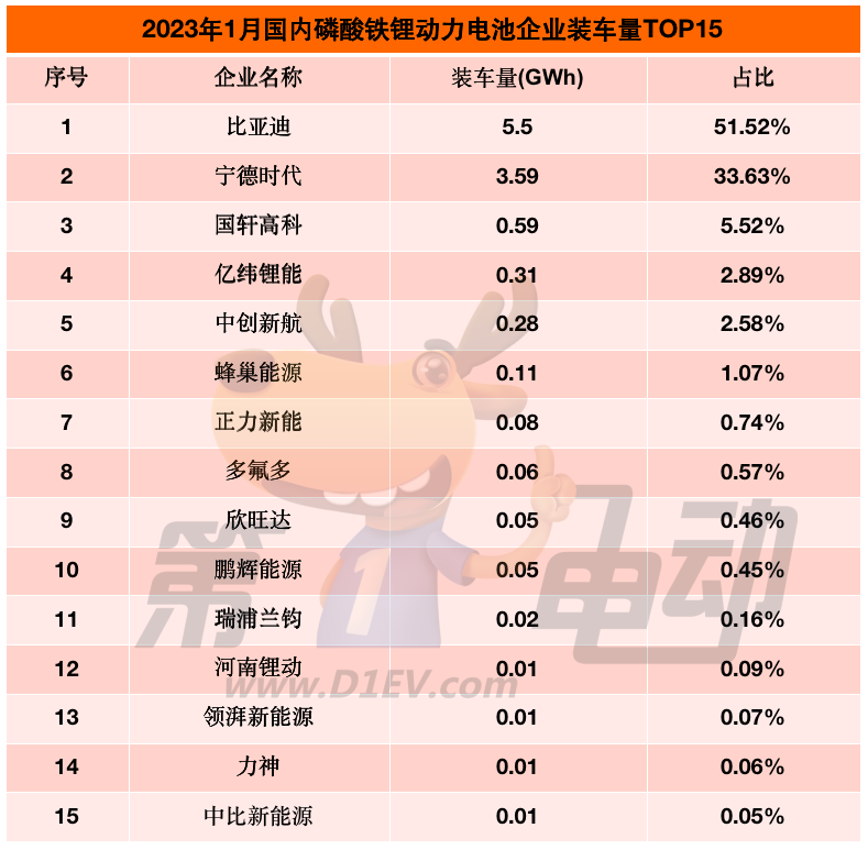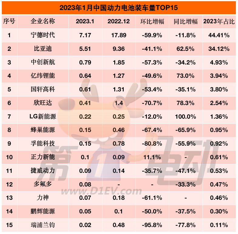 1月,随着我国新能源汽车销量断崖式的下降,我国动力电池装车量也随之大幅下滑。据中国汽车动力电池产业创新联盟最新数据,1月,我国动力电池装车量16.1GWh,同比下降0.3%,环比下降55.4%。其中三元电池装车量5.4GWh,占总装车量33.7%,同比下降25.6%,环比下降52.4%;磷酸铁锂电池装车量10.7GWh,占总装车量66.2%,同比增长20.4%,环比下降56.7%。1月动力电池装机量出现断崖式下降,其中受到东风E70和五菱宏光MINIEV等销量的大幅下降,瑞浦兰钧环比降幅最大达95.8%,其次是孚能科技下降80.8%和欣旺达下降70.7%。由于长安、一汽、上汽、问界等车企销量的大降,宁德时代装车量7.17GWh,环比大降近60%,同比下降11.8%,市占率44.41%,相比去年同期下降5.8个百分点。即使其装车量大幅下降,但其他企业仍无法企及。国轩高科、亿纬锂能、中创新航、力神、鹏辉能源、蜂巢能源等装车量均环比腰斩。与之相反,1月动力电池市场TOP15,仅一家企业环比实现了正增长——正力新能(塔菲尔)这匹“黑马”横空出世,环比上涨11%。市占率方面,与去年相比,宁德时代下降5.8个百分点,中创新航、国轩高科、蜂巢能源、孚能科技、捷威动力、多氟多、鹏辉能源等均出现了不同程度的下滑,而比亚迪同比增长13.2个百分点,亿纬锂能、欣旺达、正力新能和力神均实现不同程度的上涨。纵观TOP15,与去年同期相比,动力电池市场格局发生巨大变化。除前三名外,1月国内动力电池装车量TOP15上其他企业排名均发生变化,动力电池第二梯队企业竞争白热化。分电池类型来看,三元电池领域,宁德时代装车量3.57GWh,占比达65.74%,与去年同期相比上涨2个百分点。中创新航市占率提升至9.56%,排名跃升至第二,而在去年排名第二的欣旺达市占率下降了近3个百分点至6.62%,排名降至第三。孚能科技的市占率下降近4个百分点至2.73%,排名下降至第六。在去年12月排名第13的比亚迪,2023年1月跌落榜单。泰星能源也未出现在榜单中,取而代之的是盟固利。对比去年12月的三元电池榜,2023年1月三元电池市场可以说是重新洗牌,除了宁德时代仍然独占鳌头外,其余企业排名均发生变化。磷酸铁锂电池领域,比亚迪以5.5GWh的装车量超过宁德时代夺冠,市占率相比去年同期上涨了13.8个百分点。而宁德时代装机量仅3.59GWh,同比大降196%,市占率下降9.4个百分点。对比去年12月的磷酸铁锂电池榜,2023年1月磷酸铁锂电池市场也是重新洗牌,不仅前三甲位置发生变化,其余名次均发生改变。但是不管发生怎样的改变,磷酸铁锂电池市场仍然呈现的是比亚迪和宁德时代“双雄争霸”的格局。随着2023年新能源市场新车的密集上市,动力电池市场装车量也会随之高涨。可以预见的是,宁德时代的霸主地位仍然无人能撼,比亚迪仍然位居其后。第二梯队动力电池企业装车量快速起量,其主要驱动力是配套热销车型,同时新能源车企为了保障供应链安全、稳定,会引入多家电池供应商,因此2023年动力电池第二梯队企业竞争会加剧,排名将不断发生变化。为专注于新能源汽车的你