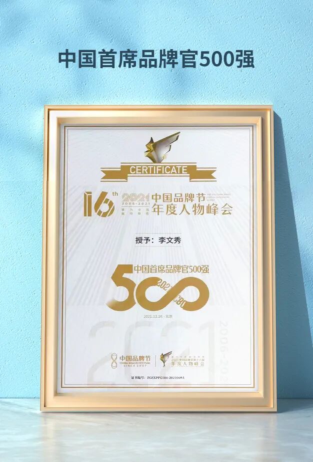 2021年12月26日,由品牌联盟(Topbrand Union)主办的2021中国品牌节第16届年度人物峰会,在北京香格里拉酒店成功举行。爱玛科技资本市场品牌建设负责人(资本运作总监)李文秀被评为2021中国首席品牌官500强。