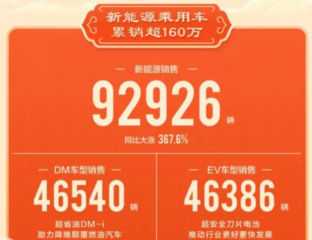 比亚迪2022年1月共销售新能源车型92926辆,同比增长367.7%。按照车型细分销量,比亚迪汉 12780辆、唐 9060辆、宋22449辆、秦 26542辆、元8569辆、e系列4364辆、海豚10602辆,其中DM系列总销量46540辆,EV系列总销量46386辆。整体接近10万台销量的比亚迪目前遥遥领先于其他品牌,有提前预定全年销量冠军的迹象。而在比亚迪接近10万辆的月销量中,新能源车型已经悄然占到98%,这说明DM车型已经彻底完成了对传统燃油车的替代。