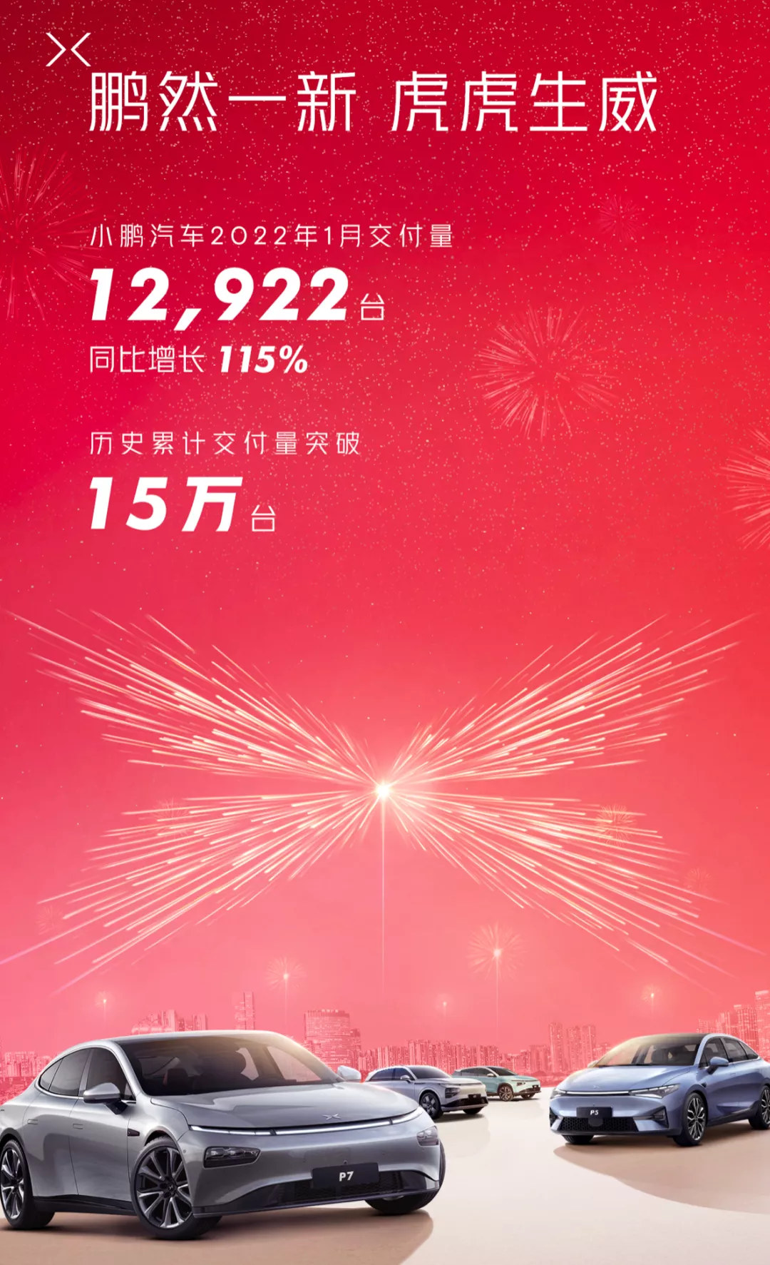 2022年1月,小鹏汽车共交付12922辆新车,同比上涨115%。其中小鹏P7交付6707辆,小鹏P5交付4029辆。小鹏汽车自上市以来,累计交付量超过15万辆。这已经是小鹏P5交付的第三个月了。作为首款搭载激光雷达的量产车,小鹏P5在空间和智能化上有着较大的优势,稳定在4000+的销量也助推小鹏再次拿到了新势力月度销冠的位置。