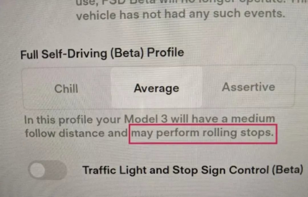 按照美国法律规定,在行经具有“STOP”标识的路口时,车辆必须完全停止,确定没有其他交通参与者通行后才可通行。而特斯拉的Rolling Stop功能,却允许车辆在监测到附近没有任何交通参与者的情况下,以最高9km/h的速度驶过十字路口。