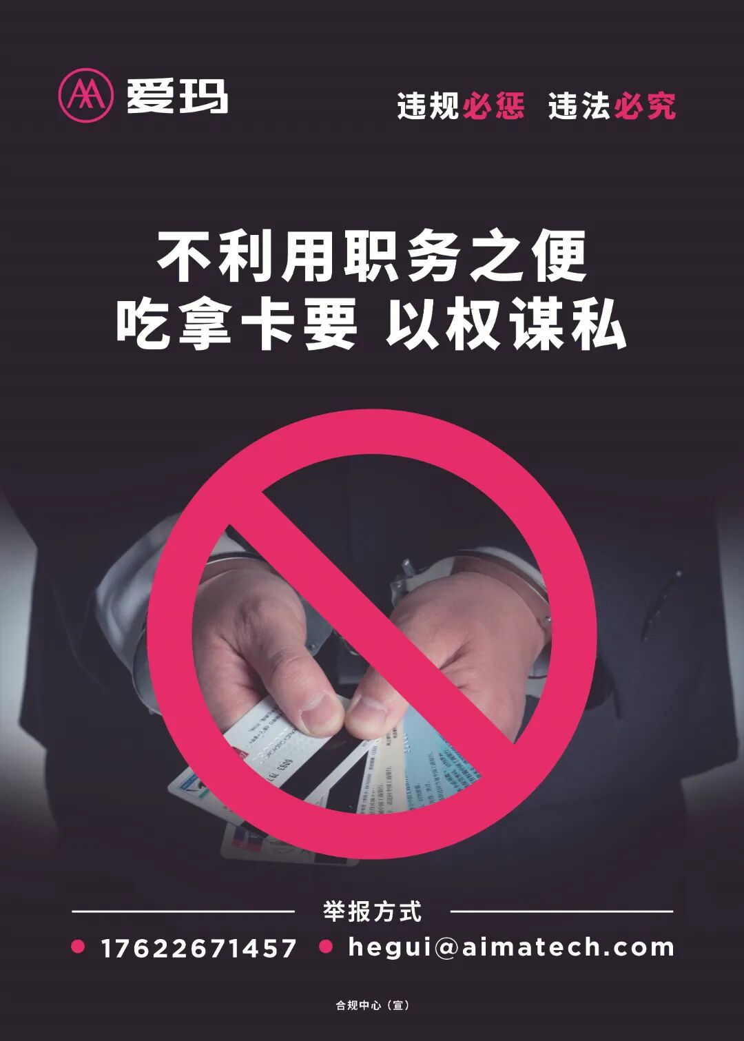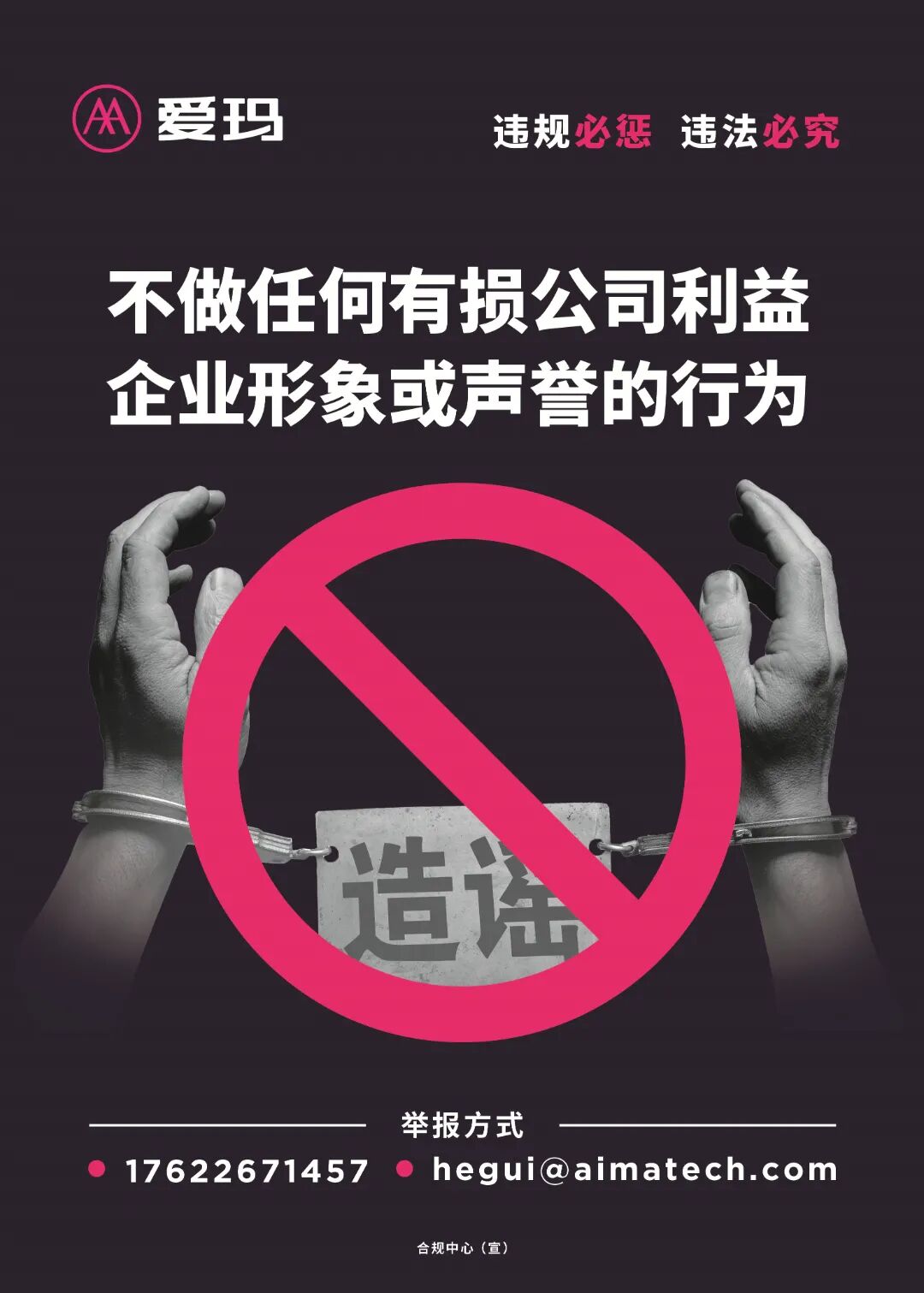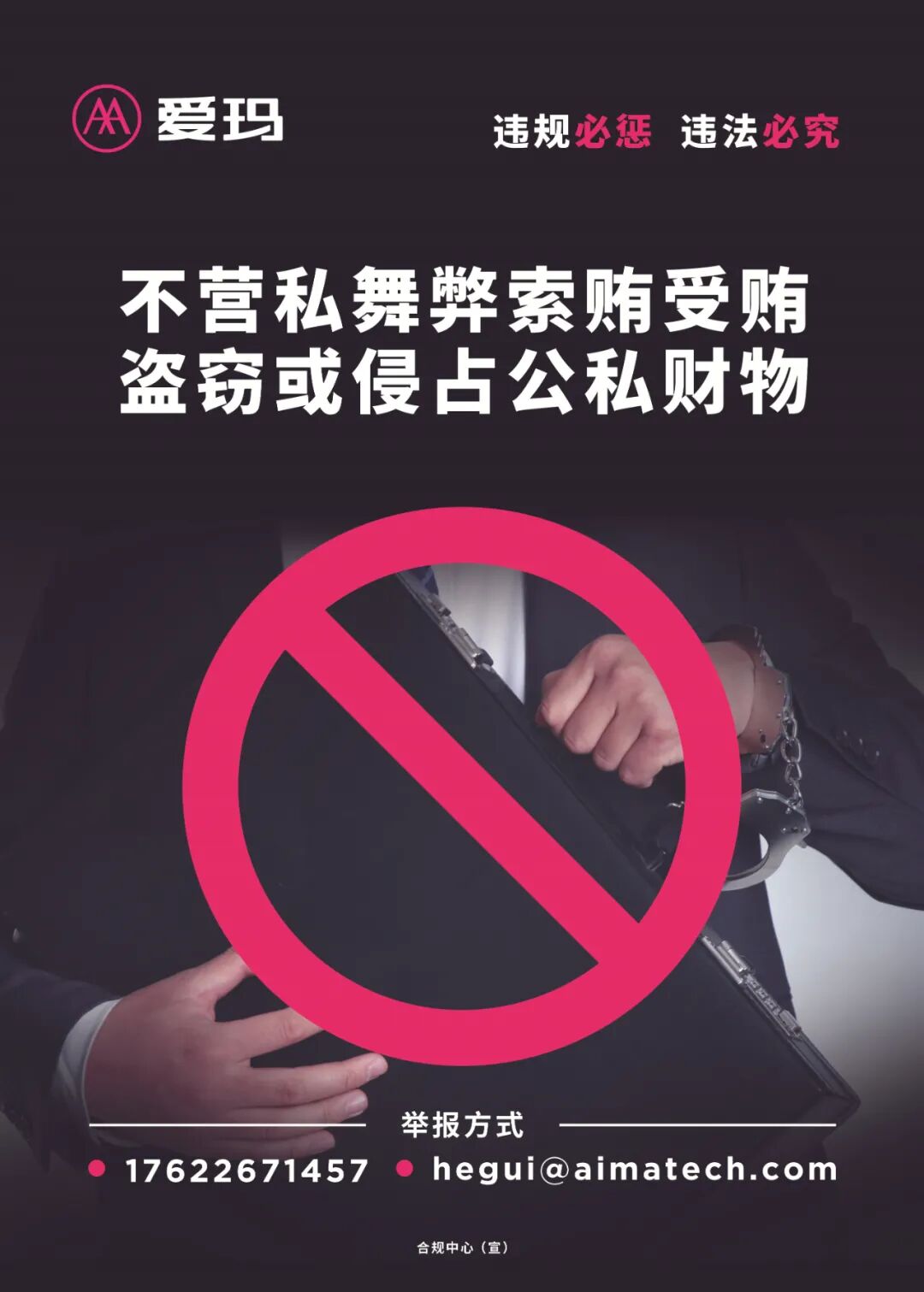 同时,集团合规中心还设立了公开举报平台:hegui@aimatech.com,供合作方举报违规行为。并明确了违规红线,一旦触及高压线,轻则解除劳动关系,重则移送司法机关追究刑事责任。