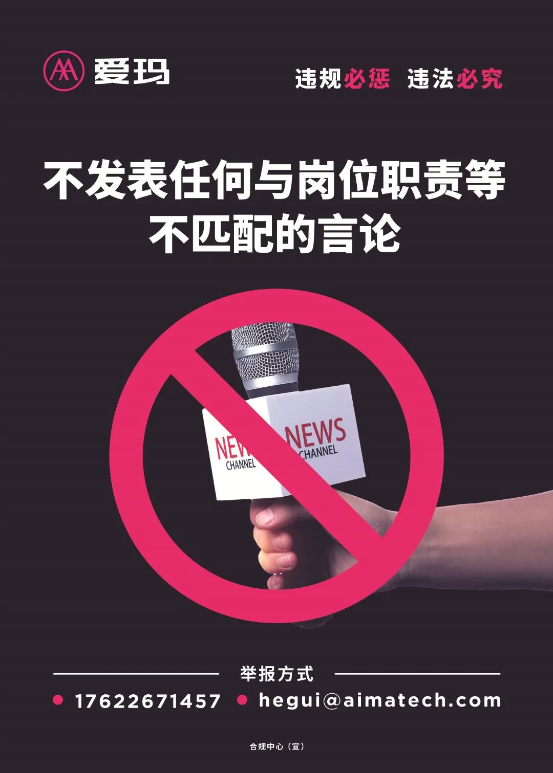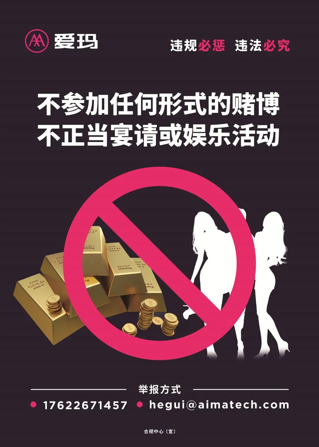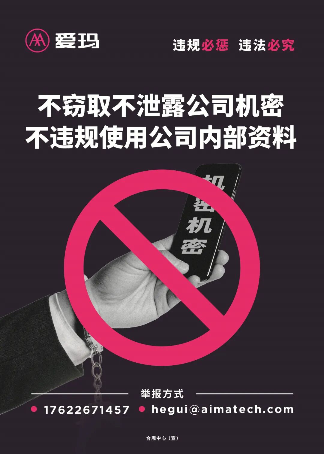 同时,集团合规中心还设立了公开举报平台:hegui@aimatech.com,供合作方举报违规行为。并明确了违规红线,一旦触及高压线,轻则解除劳动关系,重则移送司法机关追究刑事责任。