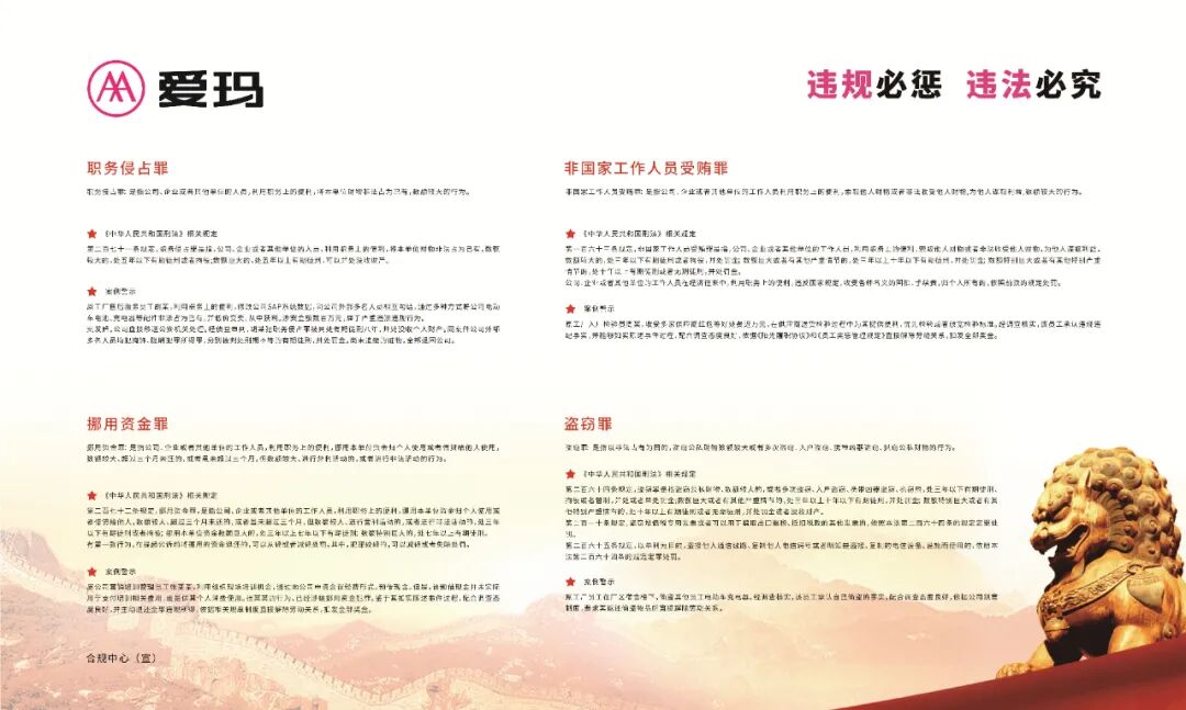 12月初,在集团新的发展要求下,为筑牢合规防线,严防职务犯罪,以案为鉴,以案促改,爱玛合规中心依据集团廉洁管理规范并结合上市公司治理准则,开展“违规必惩,违法必究”预防职务犯罪专项警示宣传活动。